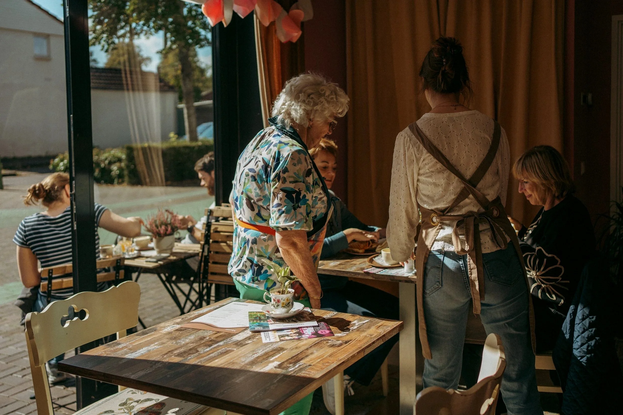 (wij zijn altijd dichtbij)Tafeltjes afruimen en schoonmaken voor de volgende gasten